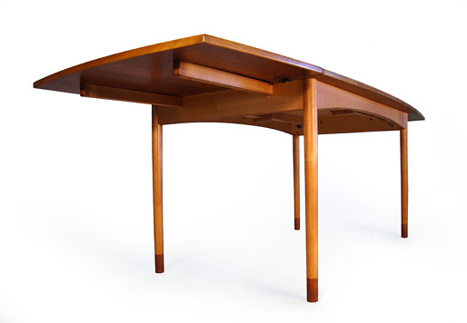 From 1942 until 1950 Børge Mogensen was the artistic director of FDB (Danish Furniture Cooperative). During this time he designed many iconic pieces of furniture that were intended for everyday use. This table is one of those. The beech and teak from which this table is constructed contrast beautifully and was a technique used by other designers such as Finn Juhl. This table is very versatile. The drop leaves can be dropped allowing space for four to dine comfortably. Remove the drop leaves and six are able to dine. And finally, raise the leaves and you have room for eight. The solid teak leg tips are a beautiful touch and are in excellent condition. The teak top is also in very good condition and it has a wonderful radiant patina. This rarely seen table would make a unique addition to any modern environment.